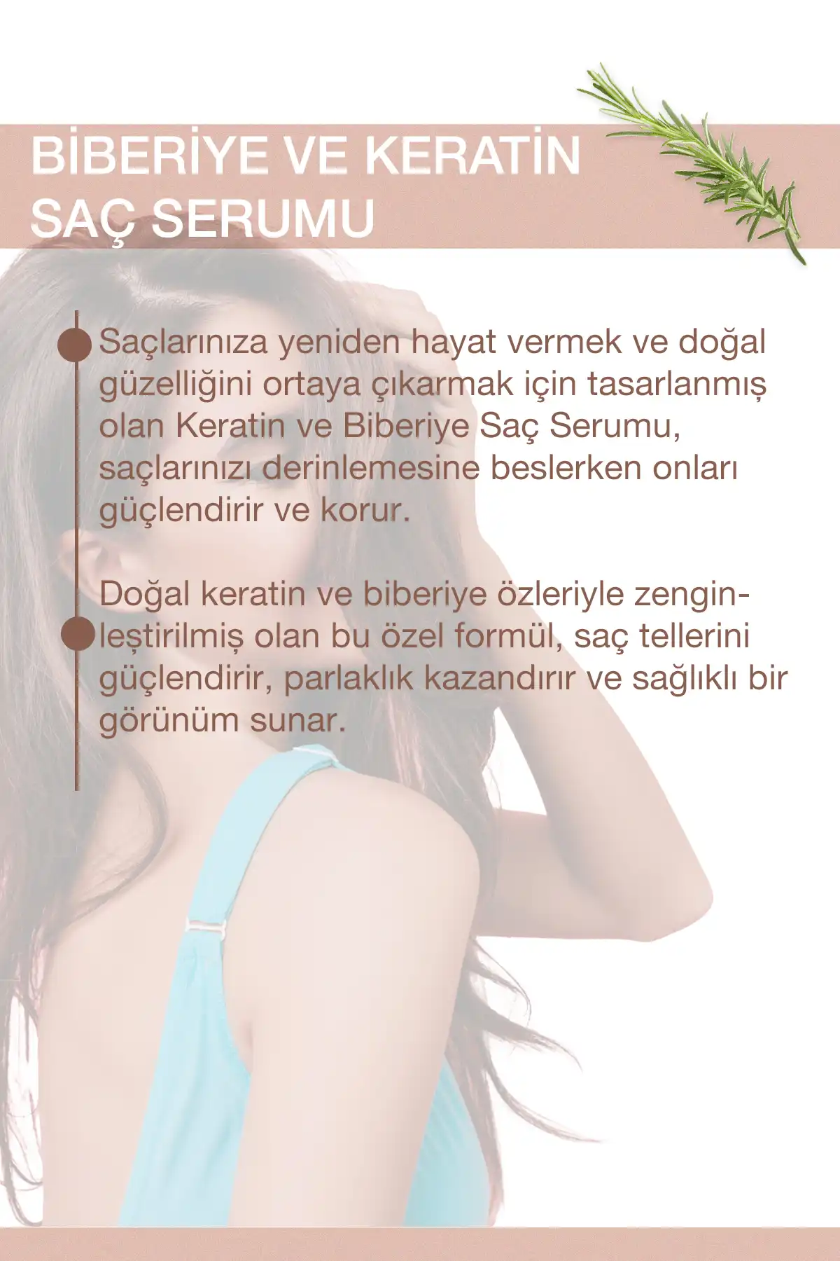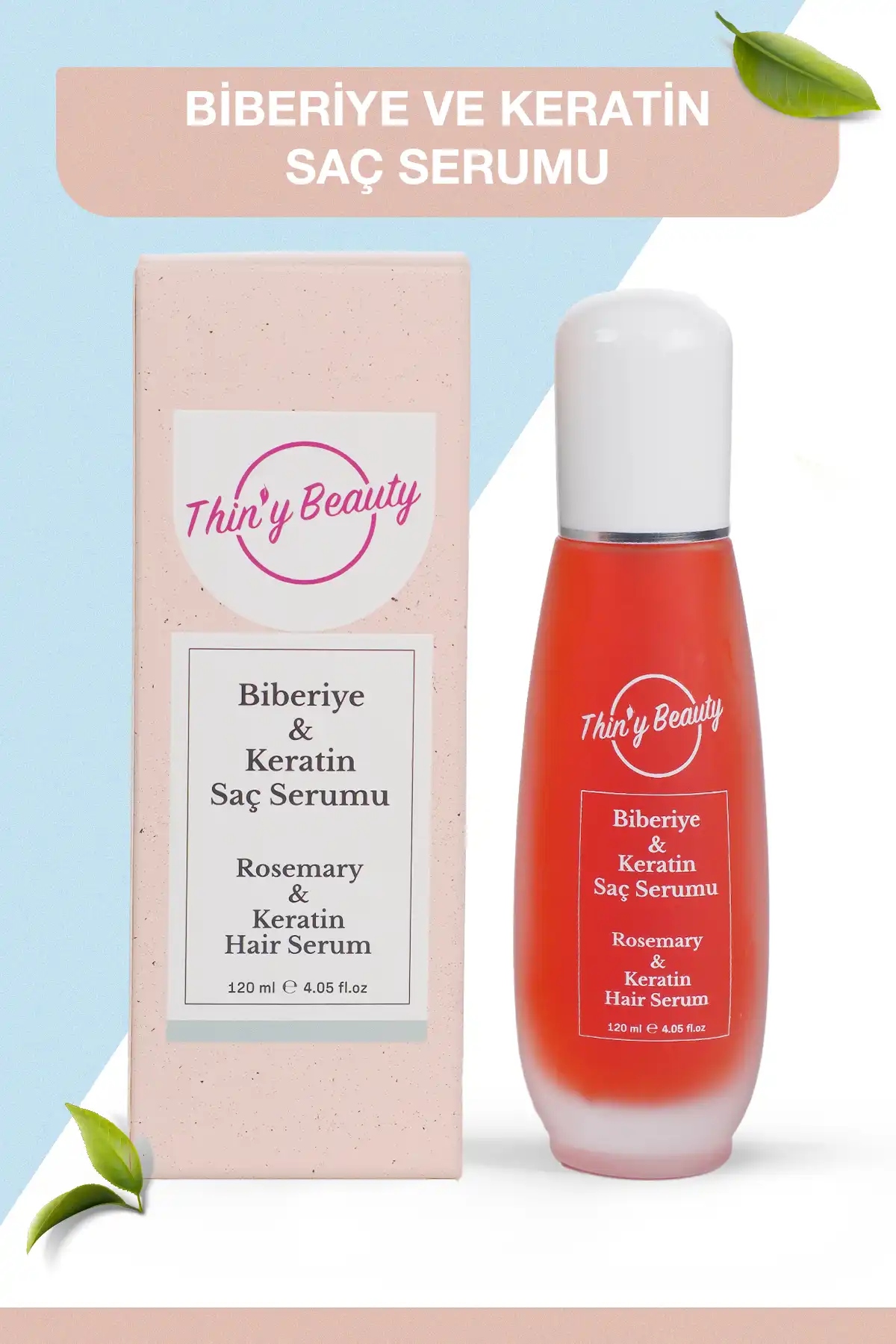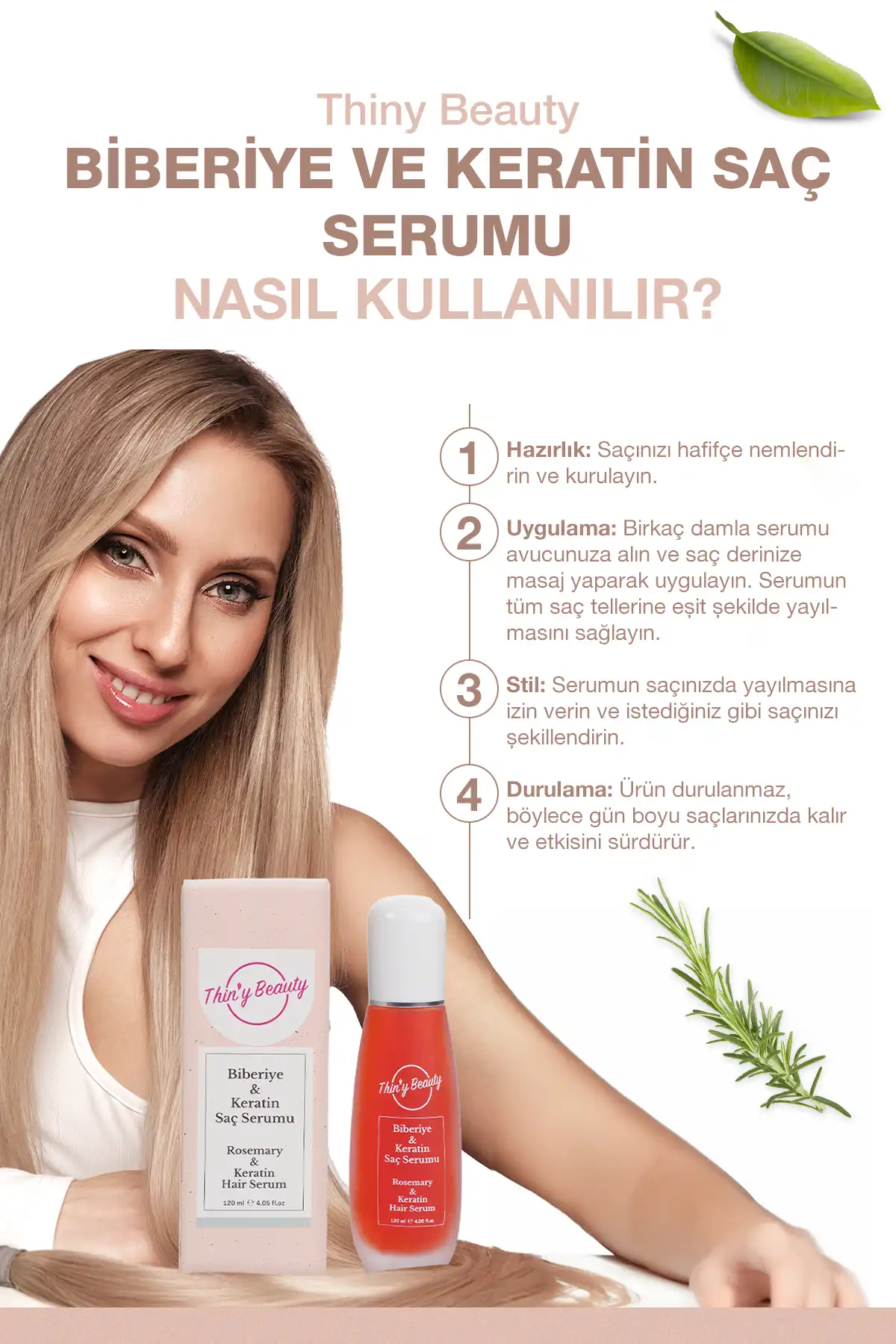 Thiny Beauty Biberiye ve Keratin özlü saç serumu Saçlarınıza yeniden hayat vermek ve doğal güzelliğini ortaya çıkarmak için tasarlanmış olan Keratin ve Biberiye Saç Serumu, saçlarınızı derinlemesine beslerken onları güçlendirir ve korur. Doğal keratin ve biberiye özleriyle zenginleştirilmiş olan bu özel formül, saç tellerini güçlendirir, parlaklık kazandırır ve sağlıklı bir görünüm sunar.